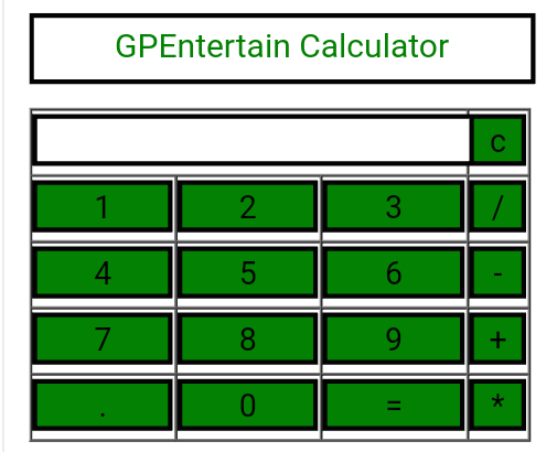 //function that display value function dis(val) { document.getElementById(\”result\”).value+=val } //function that evaluates the digit and return result function solve() { let x = document.getElementById(\”result\”).value let y = eval(x) document.getElementById(\”result\”).value = y } //function that clear the display function clr() { document.getElementById(\”result\”).value = \”\” } .title{ margin-bottom: 10px; text-align:center; width: 210px; color:green; border: solid black 2px; } input[type=\”button\”] { background-color:green; color: black; border: solid black 2px; width:100% } input[type=\”text\”] { background-color:white; border: solid black 2px; width:100% }